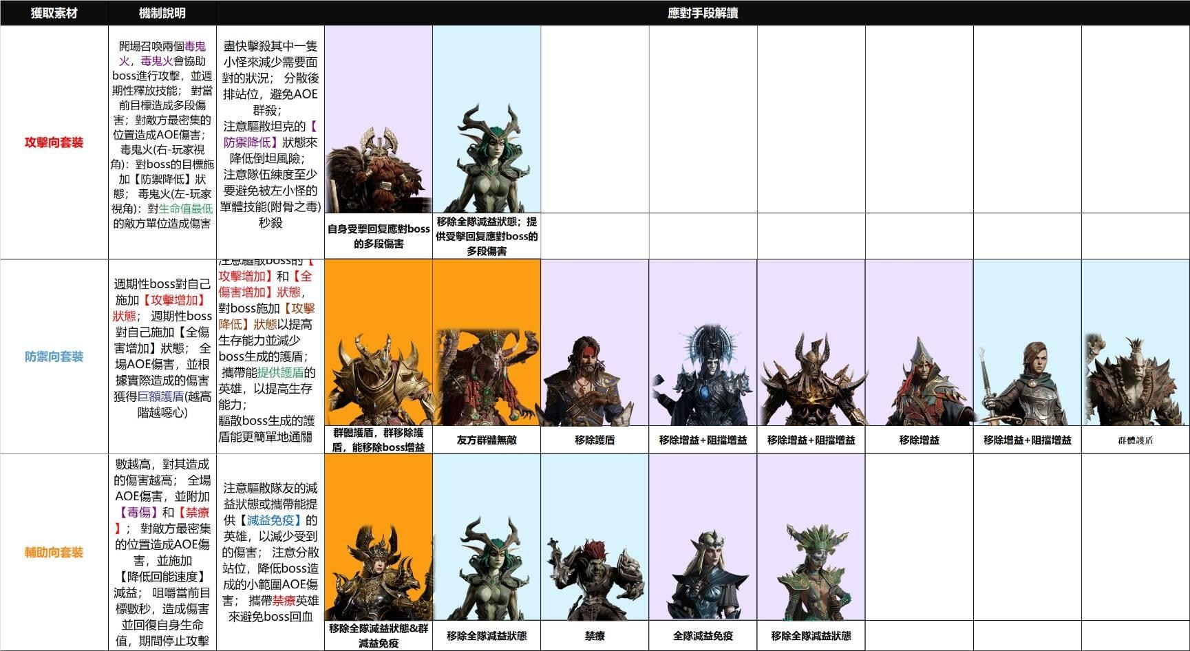 英雄裝備分爲”頭盔、武器、盔甲和手套“四件,需要盡量凑到同名套裝。而套裝可以分爲”攻擊向“、”防禦向“和”輔助向“。