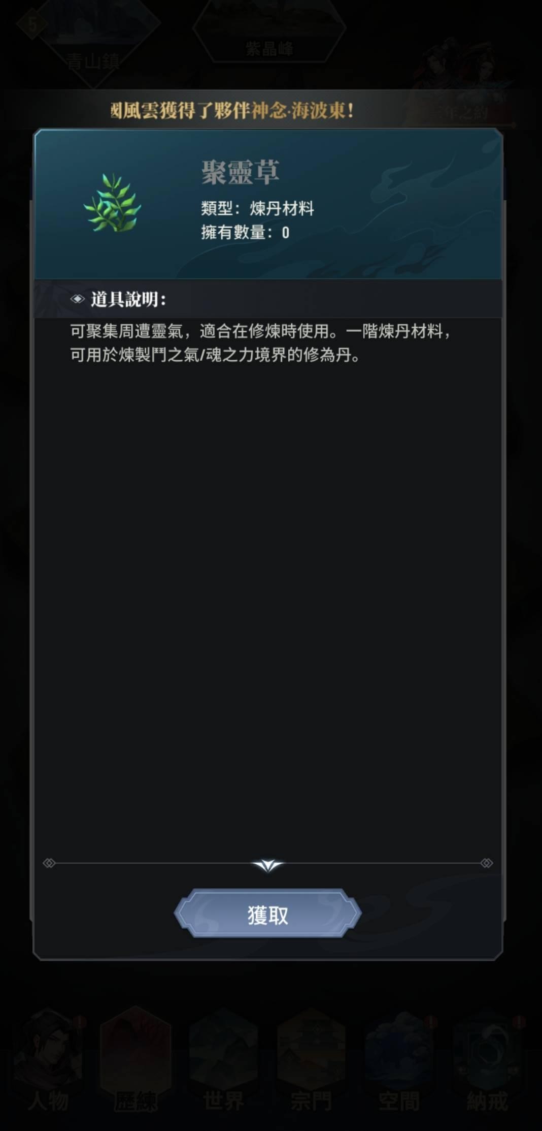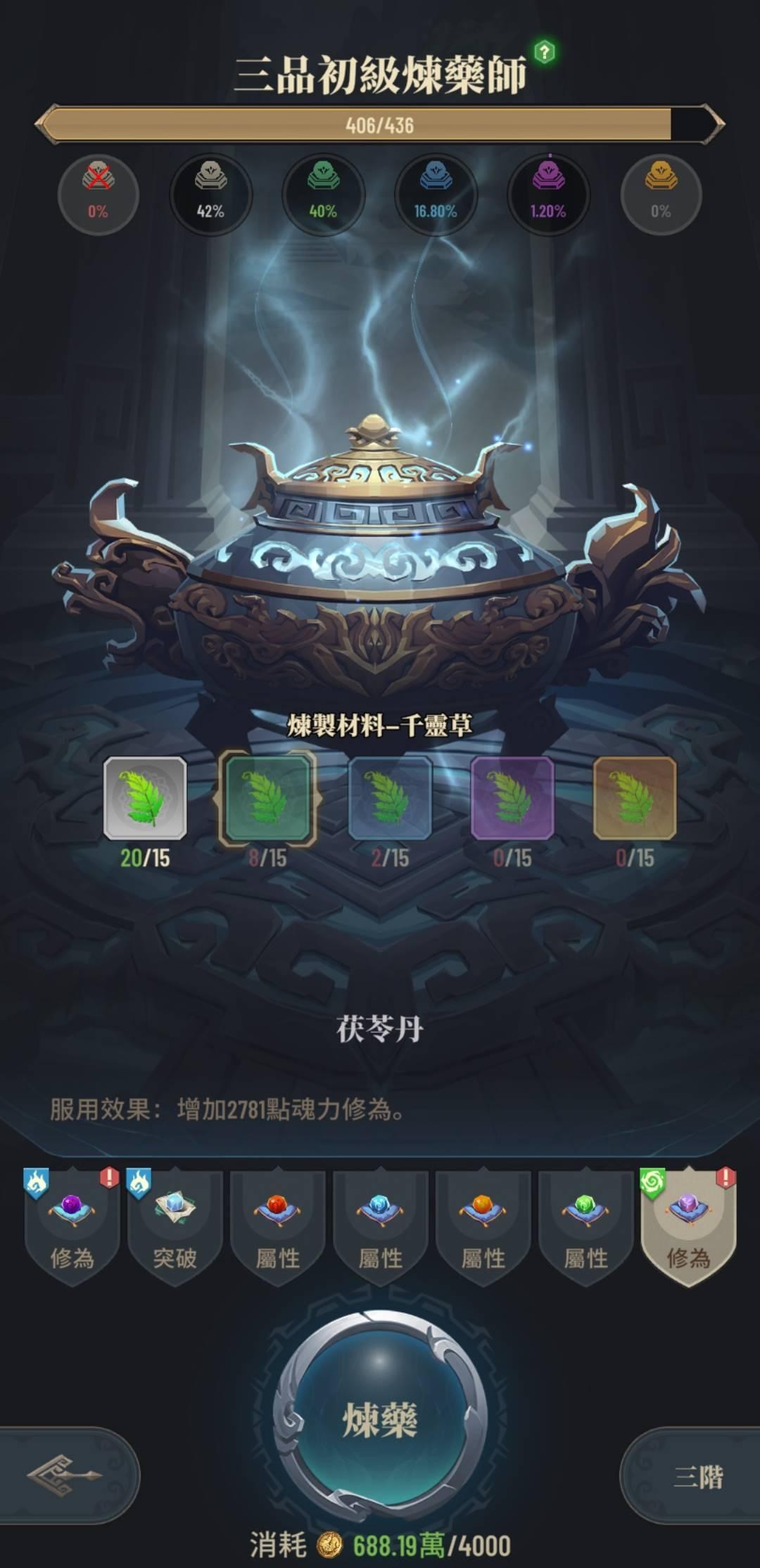 前期可以去蕭家山崖和烏坦城--也就是第一個和第二個地圖啦,盡快多收集一些材料,在高階材料不充足的情況下,多拼「聚靈草」「玄鐵」這兩項材料,多煉製多提升境界和戰力。