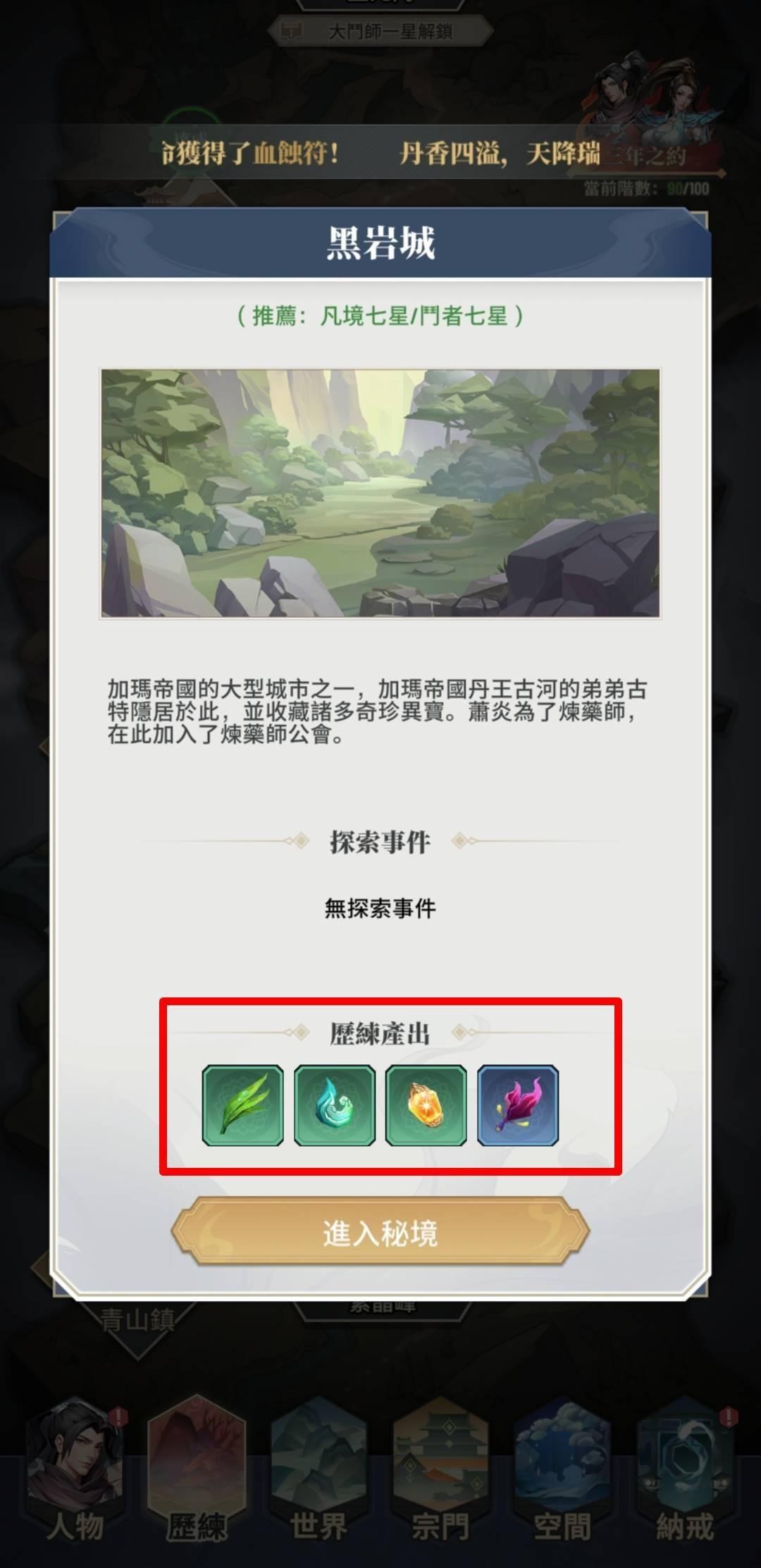 歷練有很多地圖能選,每一張地圖可獲取的物品各不相同,但相對的同時會跟你爭搶資源的玩家也是大有人在,也因為這種情況的發生,在歷練時資源獲取速度就會大幅下降,但是可以使用古龍香來增加材料產出速度的哦~