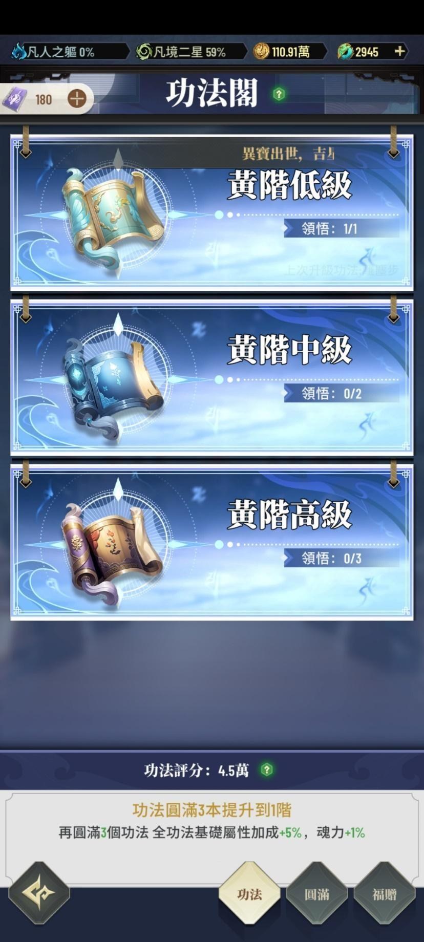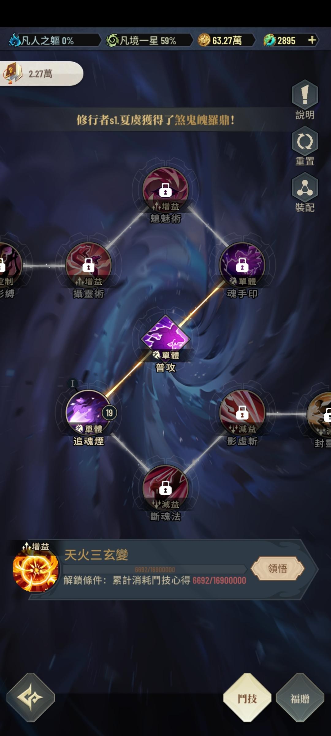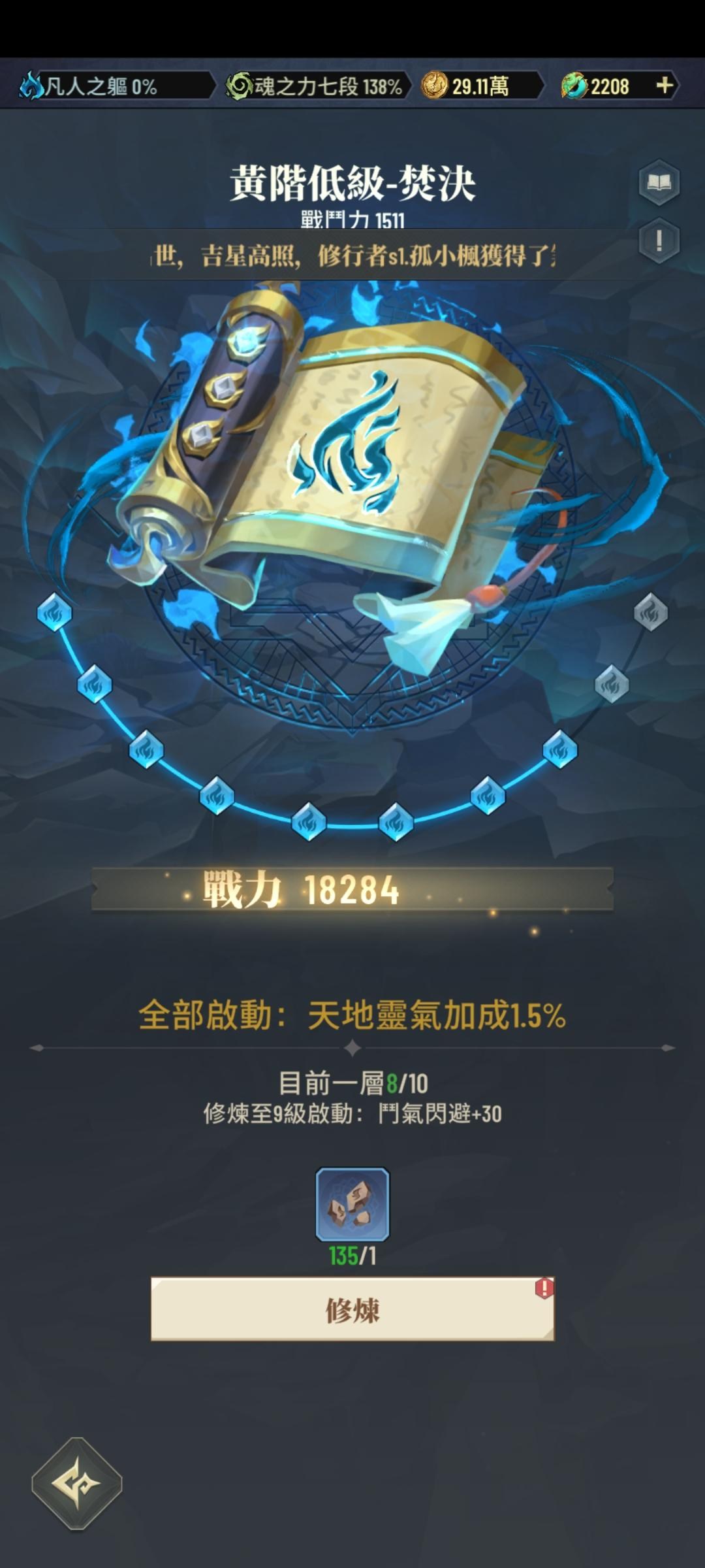 根據你修練的方向學習不同技能,在技能裝配介面進行技能裝備,安排戰鬥時的技能順序。包含法寶、異火等等主動技能也可以看到喔!
