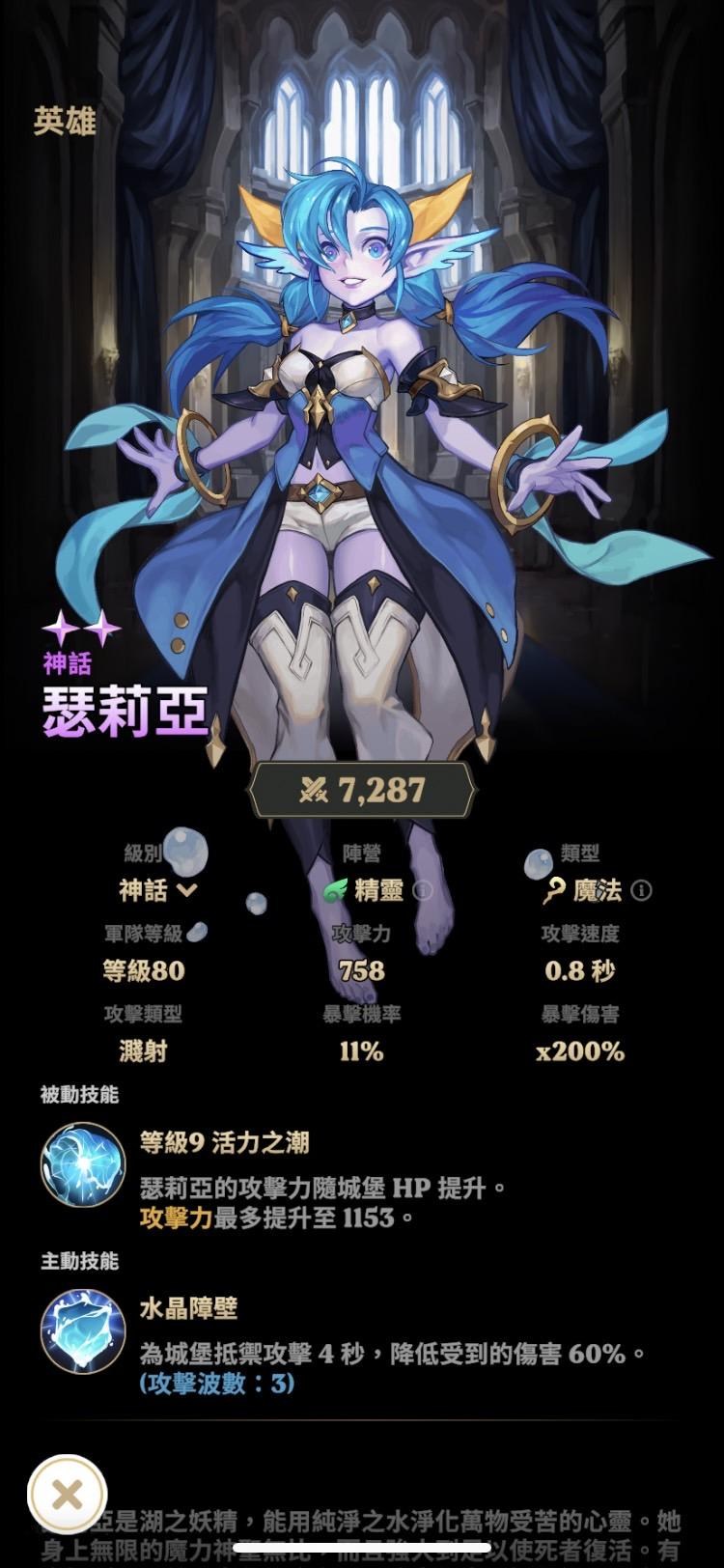 , 可以幫主堡減傷. 雖然是被動防禦, 但與其他英雄主動技的差別在於其他的英雄可能開了主動技後還是沒有把怪殺死, 或是其他英雄的主動技只適合打aoe小怪, 這隻的好處就是不管是王還是小怪都可以減傷, 只是