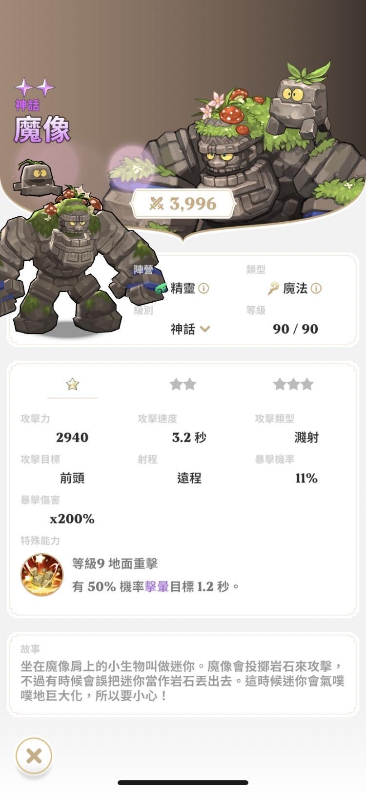 石頭人叔叔, 攻擊是遠程濺射, 被砸到的怪都有50%機會暈1.2秒, 所以是個範圍控場單位,