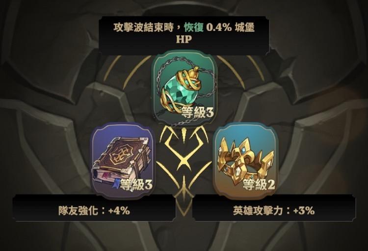 法寶的配置我會比較著重在於攻擊的部分,集中火力在攻擊可以達成效益,所以會選擇「至高頭銜」增加英雄攻擊力為優先、第二順位是「賢者魔典」的法寶,功用是隊友強化效果提升,那麼法寶「煉獄之息」裝備後每波攻擊結束時會恢復0.4%城堡HP
