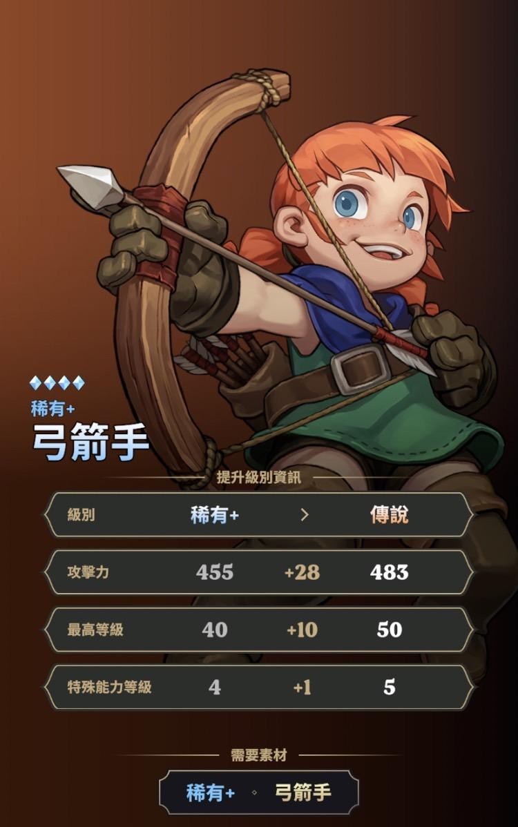 弓箭手的攻擊距離是遠程,射程較遠的情況下可以快速消滅移動速度較快的獵物,阻擋獵物攻擊城堡,這隻弓箭手對我來說算是我愛用的角色之一,加上這次有活動可以兌換這隻弓箭手,讓角色升星也會比較容易些。