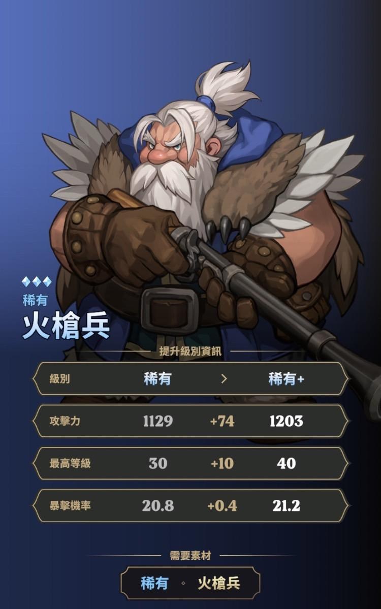 火槍兵攻擊的距離為遠程可制伏、牽制住速度型的獵物,延遲獵物移動的速度,火槍兵在隊伍上是不可或缺的角色,基本上我會把火槍兵擺放在劍士的旁邊較好互相幫助。