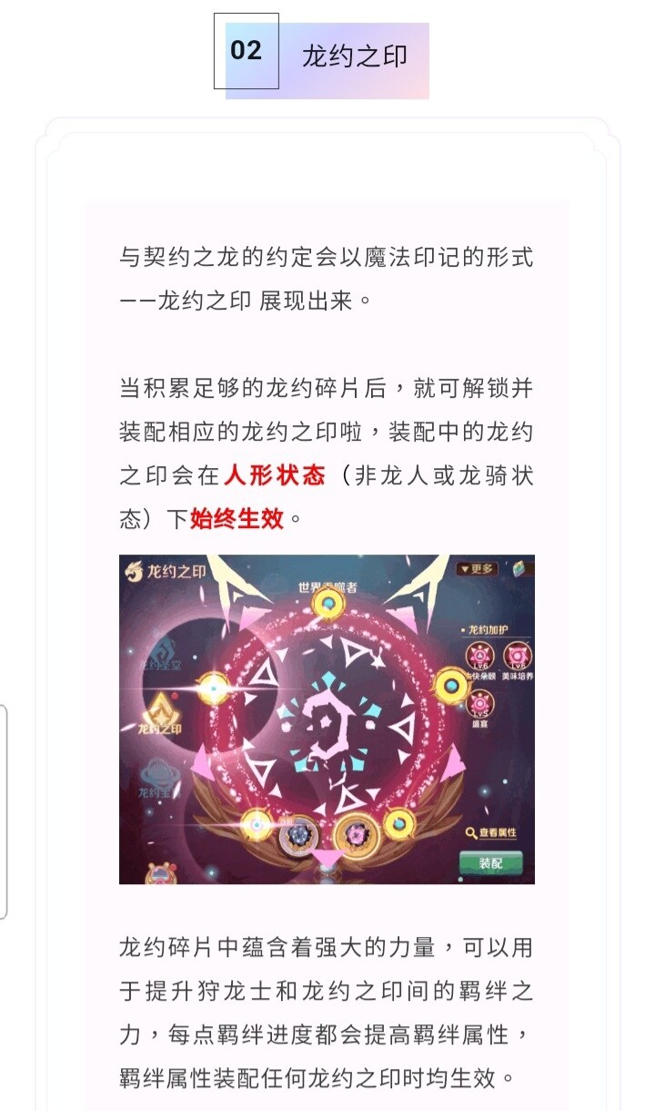 M級以上的新養成系統,外觀像掛在背後類似魔法陣的東西,龍印主要在非變身及非騎乘狀態生效,並可裝配寶具增加M傷屬性,隨更新進度透過