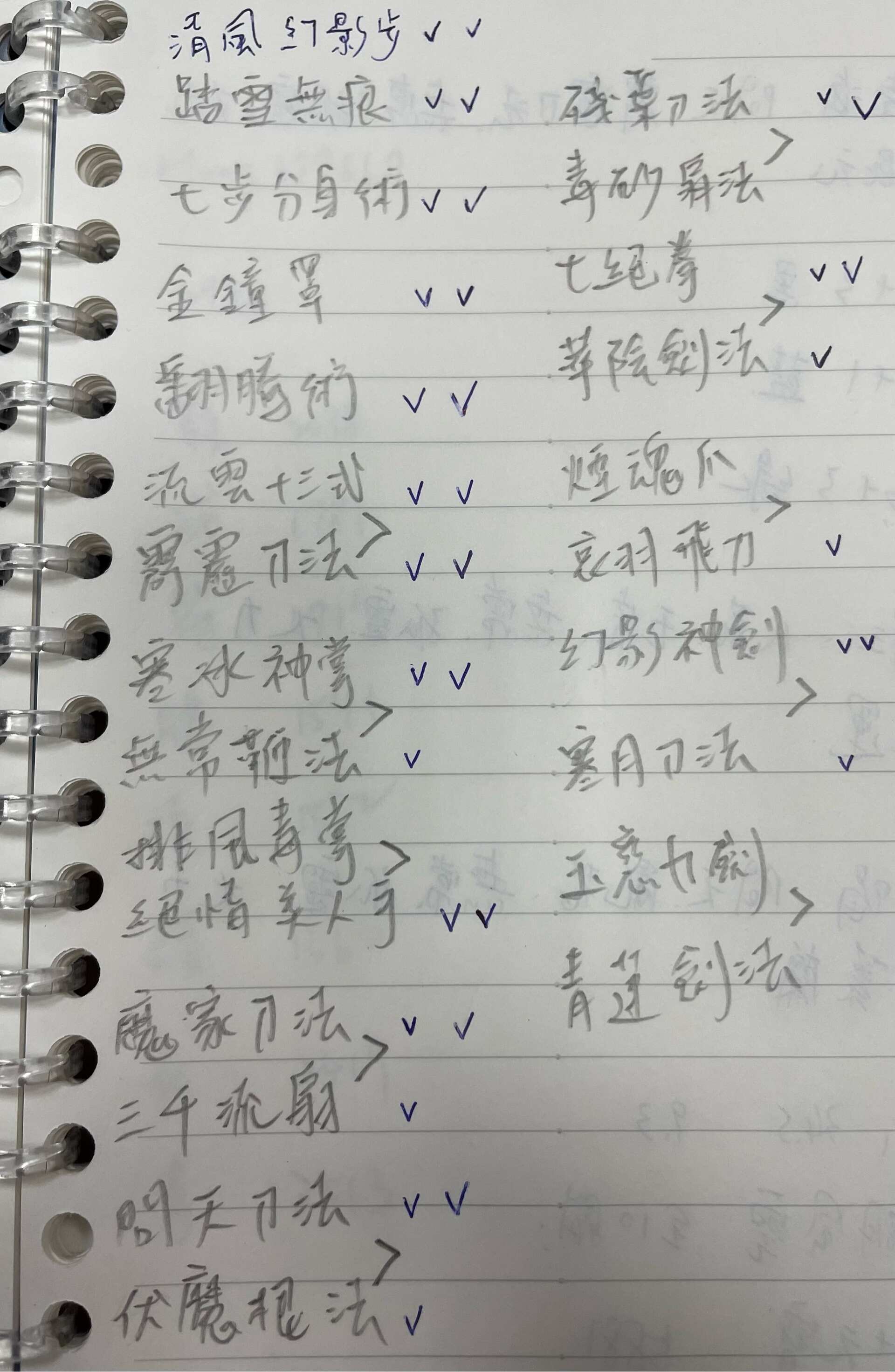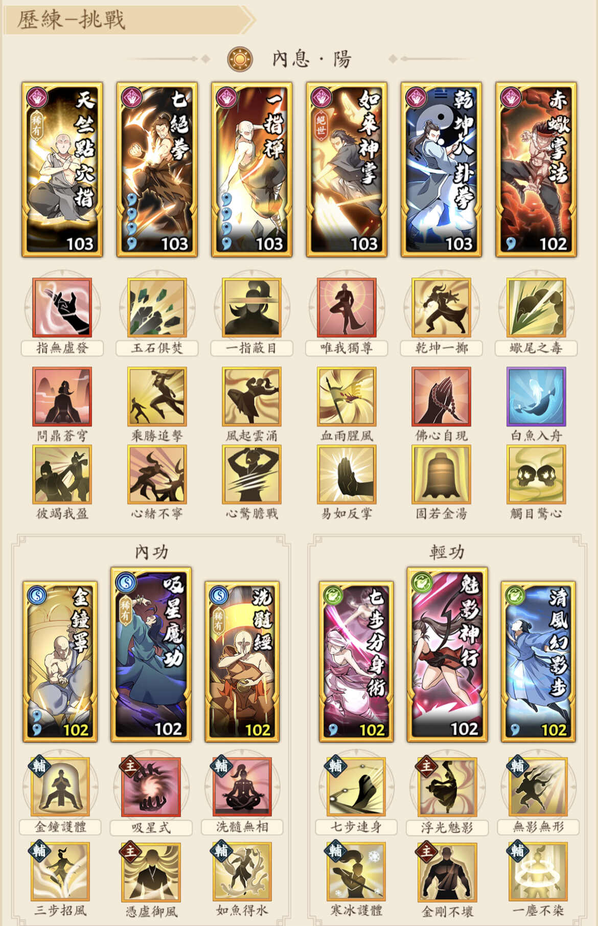 上面除了稀有武功外齊全後,開始弄關鍵招式(要兩張開起),懶得打了如下表,