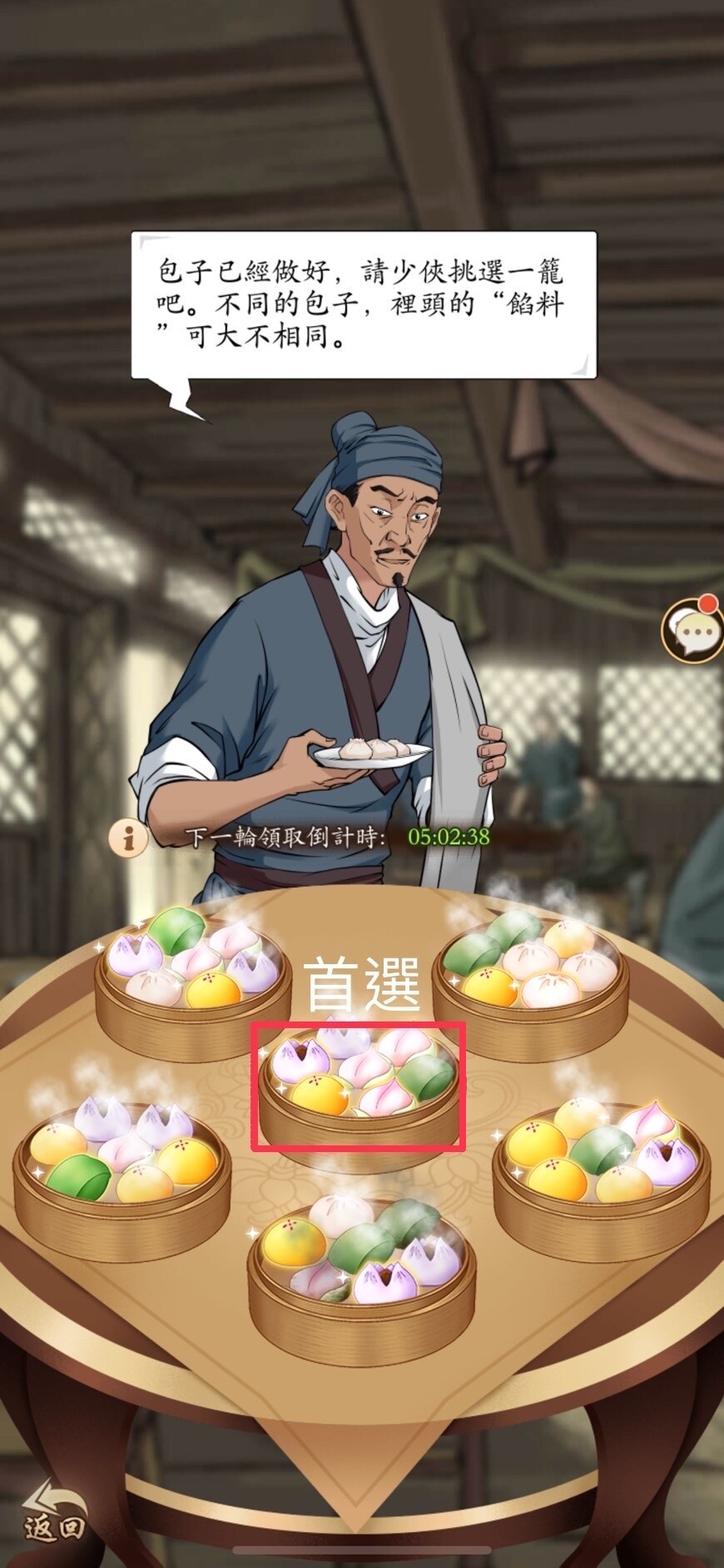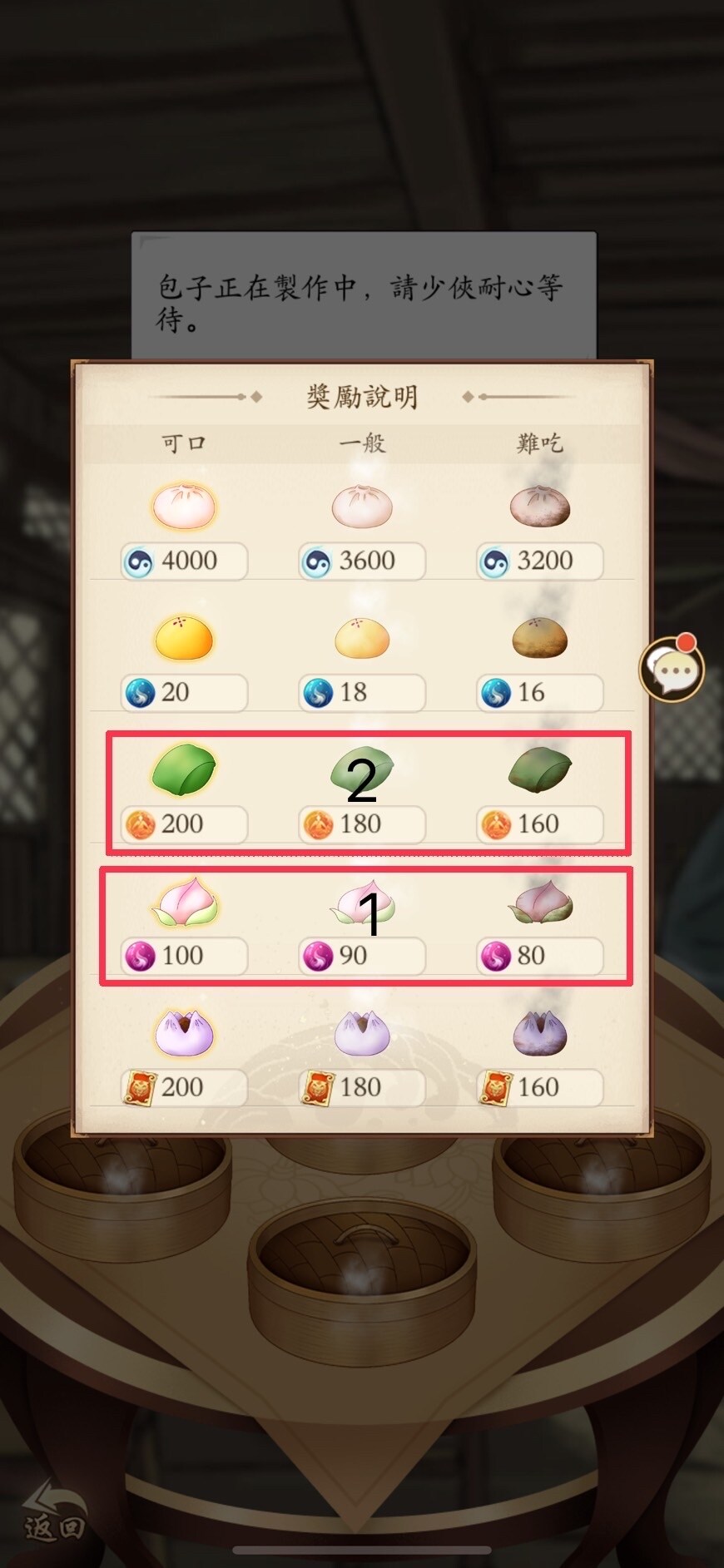 2.包子鋪-倒數時間結束就會出一籠,每個包子對應不同獎勵,優先選精要點次選修為點,