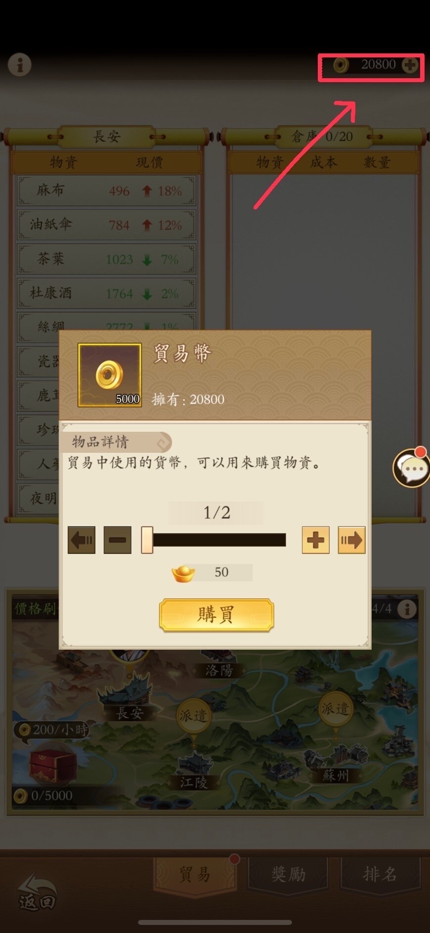 3.行商-低買高賣,每日只能跑四次點位,價格刷新在5:00(遊戲換日時間)8:00、1:00、16:00、20:00,然後記得右上角可以額外元寶買資金一定別忘了