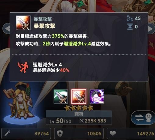 除了爆傷加乘外.她的觸發技能提供了地圖推關階段相當重要的敵方迴避下降