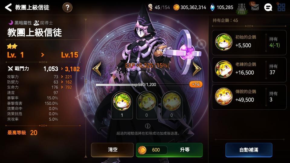 本來一開始看到1帶3時的企鵝裝置拿到的EXP是有點失望的,不過在經過不同組合的測試後