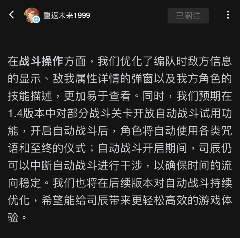 陸服預計在1.4版本開放部分關卡的自動戰鬥試用